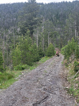 Up and up I went until there was no more up. I had reached Roger's Pass and the continental divide! Heck yes! A quick cheer and some photos later I found the rest of the group waiting not far from the pass sign. Now came the hard part. The descent. This was to prove some of the most challenging riding we'd done yet. We finally got to leave Montana 200 (thank goodness) but were now traversing rutted, rocky, backwoods "gravel" perhaps along the lines of an ATV trail. At this point it had started raining as well which only added to the "fun". I am no stranger to hike-a-biking and quickly nope-villed much of the descent. It may have really slowed me down but I knew the alternative would not end well. Eventually it did turn into more of dirt road and I was able to get back on my bike. There were a few creek crossings of various depths. I was able to ride though the first couple. Though I had to ford the last few by foot. It was another wet day. At this rate I'm going to run out of dry socks rather quickly......